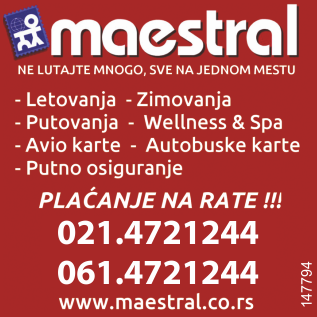 Turistička agencija MAESTRAL Novi Sad spada u posredničke turističke agencije. U ponudi turističke agencije Maestral nalaze se aranžmani svih važnih turističkih agencija iz Srbije. Ne lutajte mnogo. Na jednom mestu možete pronaći veliki broj programa po istim cenama i uslovima kao i kod organizatora. U našoj ponudi nalaze se aranžmani za putovanja po Evropi i svetu, evropske metropole, izleti po Srbiji, ponude za letovanje, zimovanje, doček Nove godine u zemlji i inostranstvu, autobuske karte i avio karte, on-line rezervacije hotela u celom svetu, putno osiguranje,...