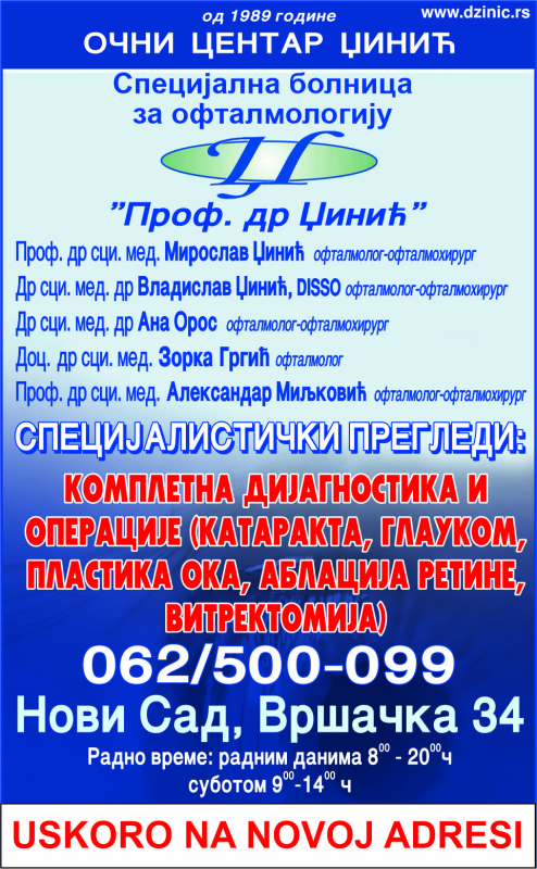 Operativno lečenje je organizovano u savremeno opremljenom hirurškom bloku, sa operacionom salom i apartmanima po tipu dnevne.Nakon dvadesetogodišnjeg iskustva i rada porodice Džinić, u ulici Vršačka 34 u Novom Sadu, na preko šesto kvadratnih metrara, smešten je Očni centar Đžinić koji predstavlja jedan od najvećih oftalmoloških centara u regiji. Očni centar Džinić radi po najvećim svetskim strandardima kako bi na što bolji način opravdali poverenje naših pacijenata.