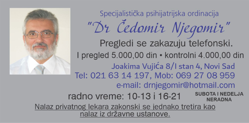 cena prvog pregleda 5000 din, kontrolni pregled, savetovanje ili psihoterapija 4000 din u trajanju od 45 min do sat vremena